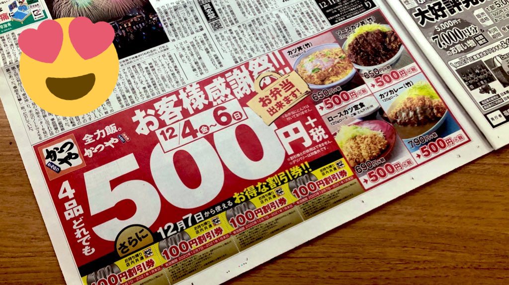 RT by @yomiojo: \🉐お得な割引券が4枚も🉐/ 🔔読売新聞12月4日(金)朝刊に🔔 【12月7日(月)から使える】 お得な割引券ついてます🤗 📺テレビ欄の裏をチェック👀✨ 切り取り忘れに注意ですよー✂️ #かつや #読売新聞 #お得 #お客様感謝祭