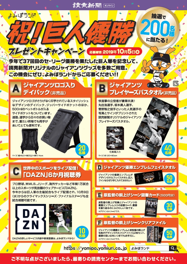 読売新聞オンライン 祝!巨人優勝プレゼントキャンペーン 応募締切10/5
