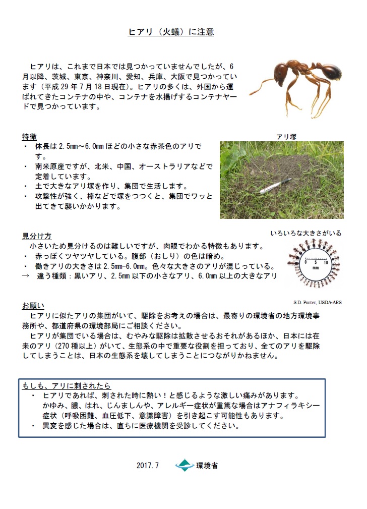 2017.07.27 2025.05.17 ヒアリにご注意 ~環境省より~ Post Share Hatena Line note ヒアリに関しては多くのご関心をお寄せ頂いています。 このページではこれまで環境省が公表した情報や、参考となる資料をまとめています。 http://www.env.go.jp/nature/dobutsu/fireant.html 読売新聞の購読サポート「よみサポ」の新CMができました 前の記事 滋賀県読売会ホームページ リニューアル 次の記事
