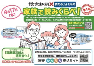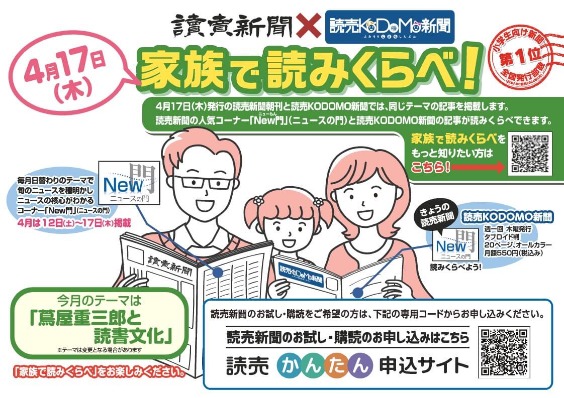 2025.04.10 2025.05.17 家族で読みくらべ Post Share Hatena Line note ◆読売新聞New門掲載期間(4/12~17)のうち、KODOMO新聞(4/17)の フロントページとNew門の記事を同一テーマで展開します。 テーマは 『蔦屋重三郎と読書文化』です。 ◆読売新聞公式かんたん申込サイトはこちら 4月 LINEUP 前の記事 新聞を読むと賢くなる?!凄すぎる読売新聞の魅力を徹底解剖! YouTube動画紹介 次の記事