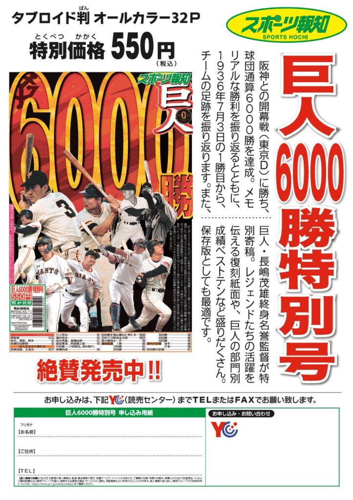 スポーツ報知「巨人6000勝特別号」 絶賛発売中!
