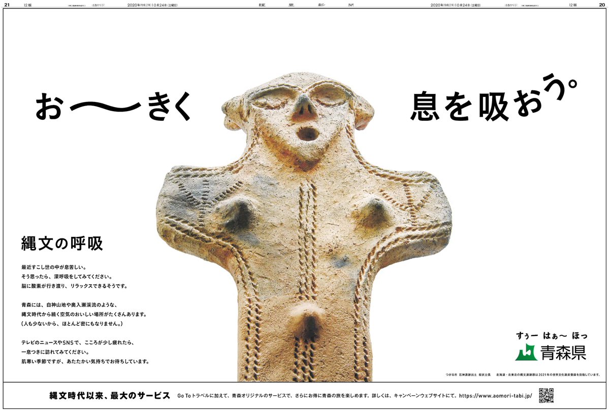 本日の #読売新聞 に巨大な #土偶 が出現! #青森県 は、Go Toトラベルに加えて、オリジナルのサービスでさらにお得に青森の旅を楽しめるキャンペーンを近日開催。 青森県に深呼吸しに行きたくなりますね! aomori-tabi.jp/ #新聞広告 #GoToトラベル #縄文の呼吸
