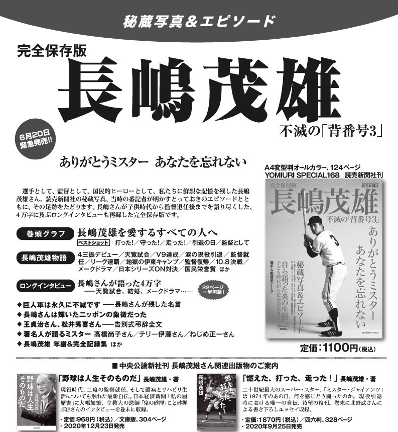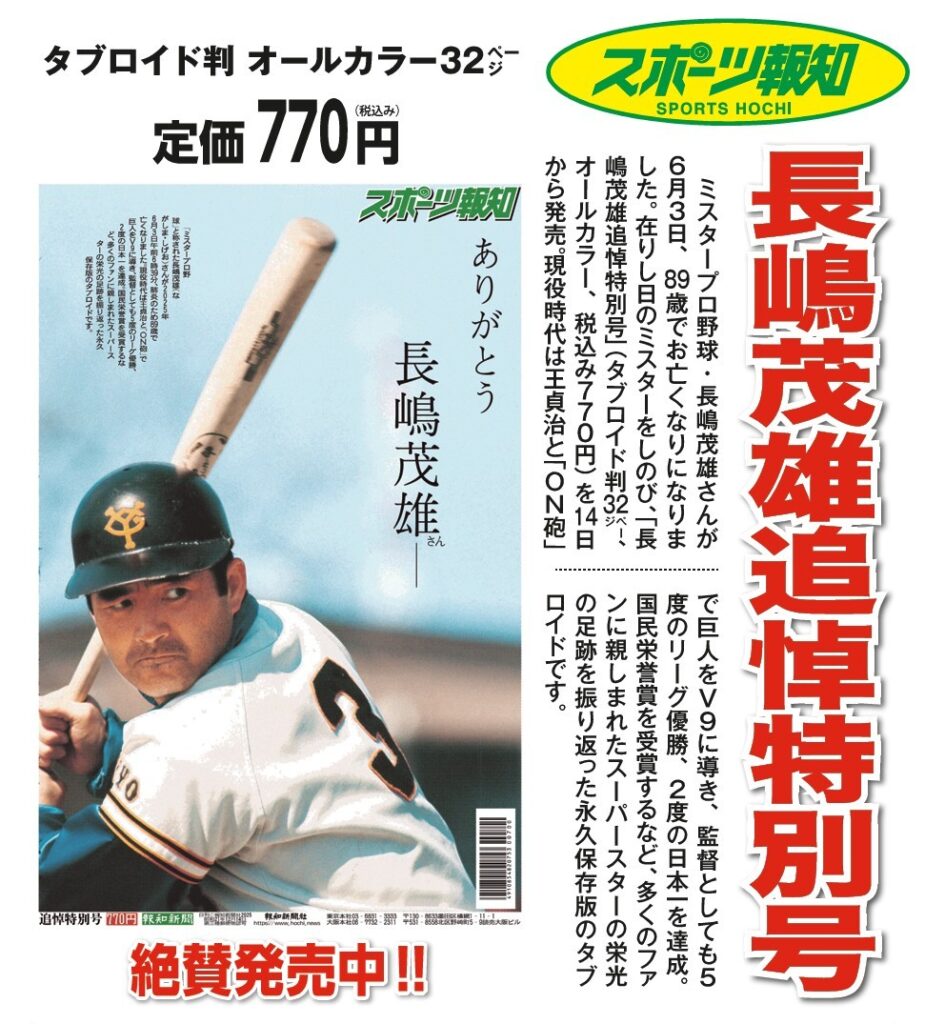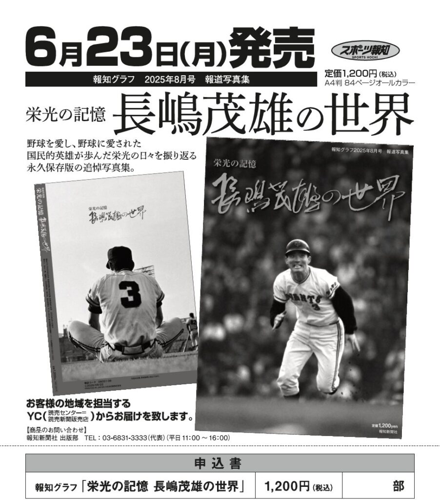 読売新聞社 2025.06.19 長嶋茂雄 読売新聞・スポーツ報知 各種特別号販売! Post Share Hatena Line note 長嶋茂雄追悼特別号(タブロイド判 32ページ)定価770円 6月17日発売 長嶋茂雄の世界(A4判 80ページ) 定価1,200円 6月23日発売 完全保存版 長嶋茂雄 不滅の「背番号3」 (A4変型判 124ページ) 定価1,100円 6月20日発売 その他 ◆お申し込みは、お近くの読売新聞販売店まで 6月 LINEUP 前の記事 7月 LINEUP 次の記事