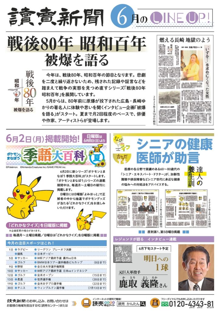 2025.06.11 6月 LINEUP Post Share Hatena Line note ◆読売新聞公式かんたん申込サイトはこちら 新聞で脳活始めませんか? 前の記事 長嶋茂雄 読売新聞・スポーツ報知 各種特別号販売! 次の記事