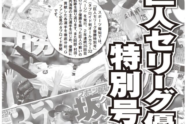 スポーツ報知から、巨人セ・リーグ優勝特別号が発売されています。定価¥300 タブロイド判オールカラー32ページ!2年連続35回目のリーグ優勝を飾った巨人の戦いの軌跡を振り返ります。また、阿部・村田