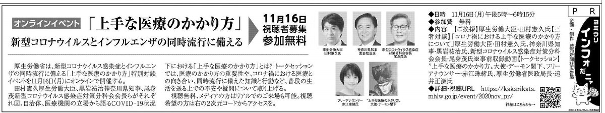 コロナ とインフルエンザ の同時流行に備える厚生労働省 の無料オンラインイベント! 田村厚生労働大臣、尾身茂さん、デーモン閣下、赤江珠緒さんらが登場。生活を送る上での不安や疑問を取り上げます。11月16日(月)17時~ 事前登録不要で下記から視聴出来ます。